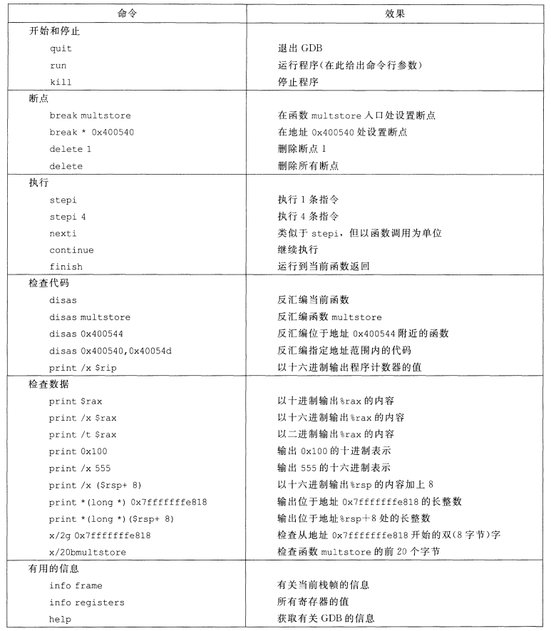 机器级程序和它们的汇编代码表示,与C程序的差别很大。各种数据类型之间的差别很小。程序是以指令序列来表示的,每条指令都完成一个单独的操作。部分程序状态,如寄存器和运行时栈,对程序员来说是直接可见的。本书仅提供了低级操作来支持数据处理和程序控制。编译器必须使用多条指令来产生和操作各种数据结构,以及实现像条件、循环和过程这样的控制结构。我们讲述了C语言和如何编译它的许多不同方面。我们看到C语言中缺乏边界检查,使得许多程序容易出现缓冲区溢出。虽然最近的运行时系统提供了安全保护,而且编译器帮助使得程序更安全,但是这已经使许多系统容易受到恶意入侵者的攻击。