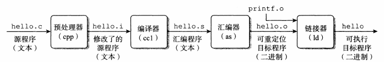 printf函数存在于一个名为printf.o的单独的预编译好了的目标文件中,而这个文件必须以某种方式合并到我们的hello.o程序中。