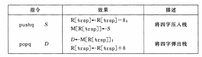 将一个四字值压入栈中,首先要将栈指针减8,然后将值写到新的栈顶地址。