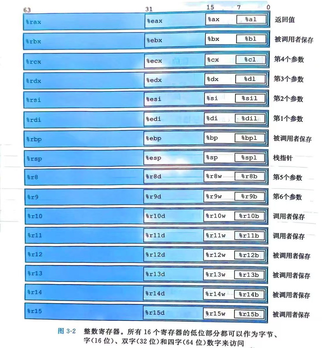 一个x86-64的中央处理单元(CPU)包含一组16个存储64位值的通用目的寄存器。这些寄存器用来存储整数数据和指针。图3-2显示了这16个寄存器。它们的名字都以%r开头,不过后面还跟着一些不同的命名规则的名字,这是由于指令集历史演化造成的。